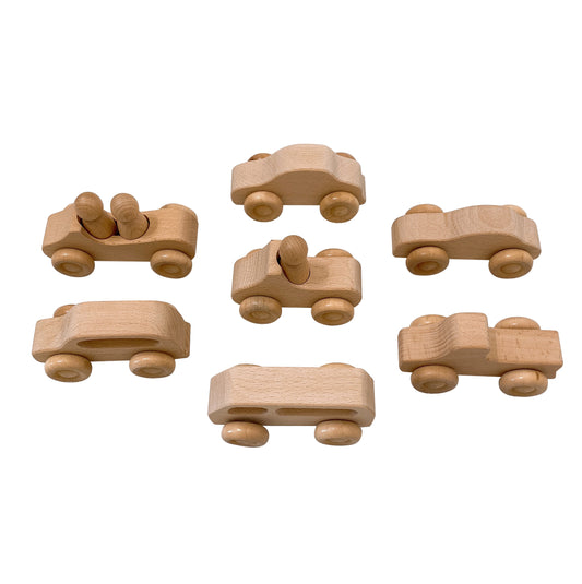 7 Pcs Natural Wooden Cars Set with 3 pcs Peg Dolls
